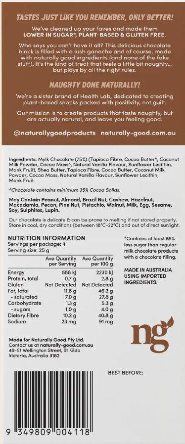 Ingredients - Mylk Chocolate (75%) (Tapioca Fibre, Cocoa Butter^, Coconut Milk Powder, Cocoa Mass^, Natural Vanilla Flavour, Sunflower Lecithin, Monk Fruit), Shea Butter, Tapioca Fibre, Cocoa Butter, Coconut Milk Powder, Cocoa Mass, Natural Vanilla Flavour, Sunflower Lecithin, Monk Fruit. ^Chocolate Contains Minimum 35% Cocoa Solids