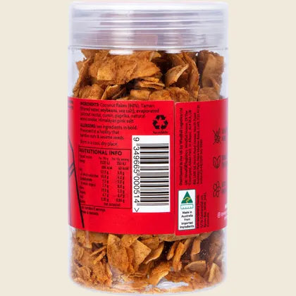 Ingredients - Organic coconut chips, organic coconut sugar, organic tamari (water, organic soy beans organic rice, salt), sweet paprika, himalayan pink salt, cumin powder, natural liquid smoke.